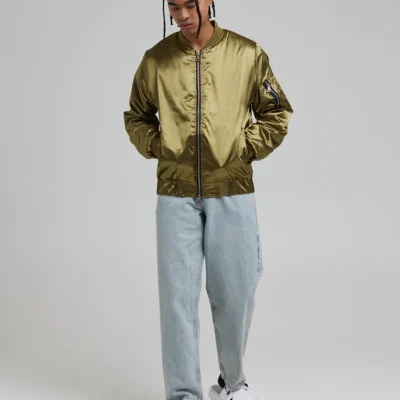 D-Struct Zacht Satin Bomber Lichtgewicht Jack Heren Khaki Maat